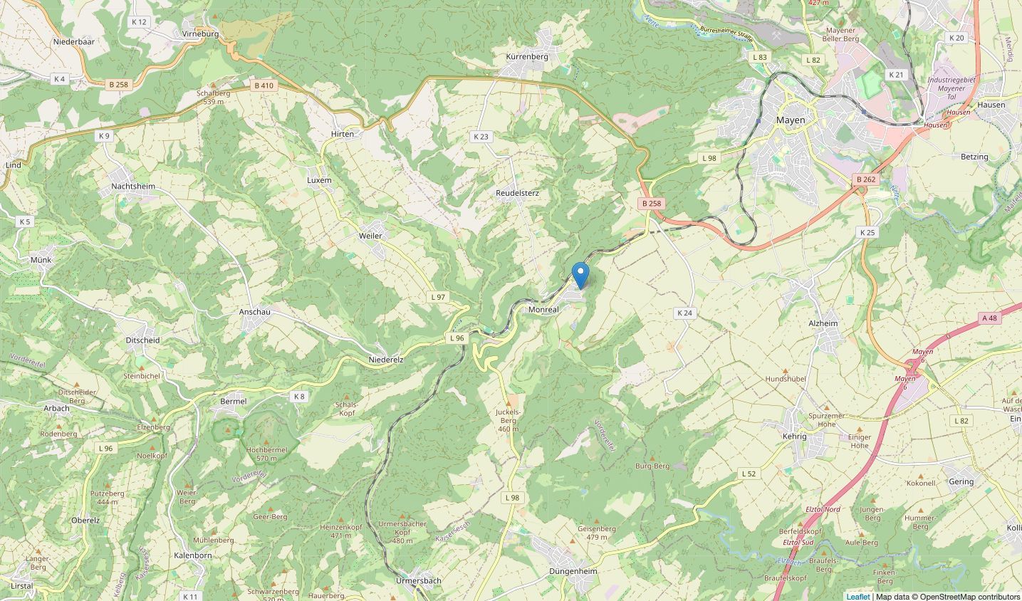 Die Immobilie befindet sich in 56729 Monreal, einem historischen Ort in der Vulkaneifel, der für seine malerische Altstadt, die Burgruinen und die attraktive Naturlandschaft bekannt ist. Die Umgebung bietet eine hohe Lebensqualität sowie eine gute Anbindung an die umliegenden Städte wie Mayen, Kaisersesch und Koblenz.