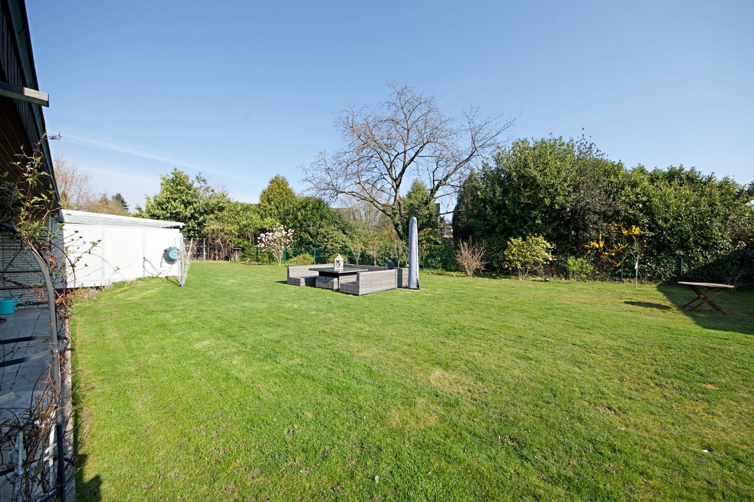 Der weitläufige Garten bildet eine grüne Oase der Ruhe und Erholung.